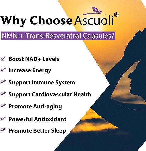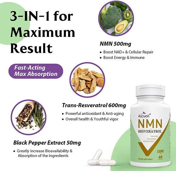 Ascuoli NMN + Resveratrol 1100mg combines powerful ingredients designed to support healthy aging. NMN helps elevate NAD+ levels, essential for DNA repair, cellular energy production, and slowing age-related decline.