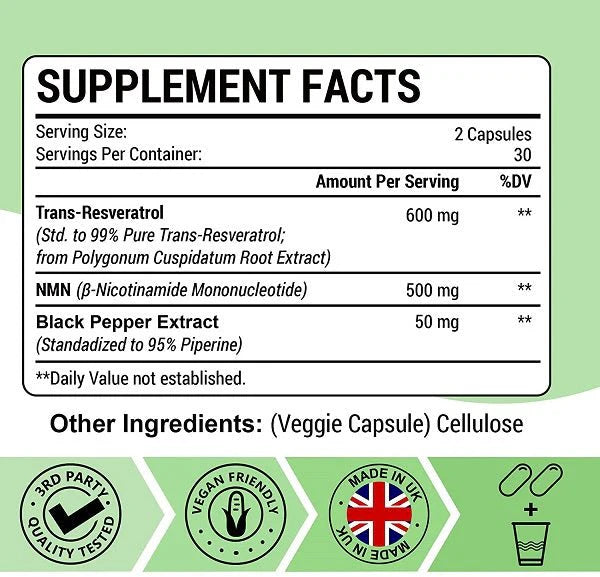 The included Trans-Resveratrol, a potent antioxidant, activates longevity-related proteins SIRT1 and SIRT3, enhancing overall cellular health. Black pepper extract boosts absorption, ensuring maximum bioavailability. Together, these three components form a scientifically backed formula aimed at promoting longevity and vitality.